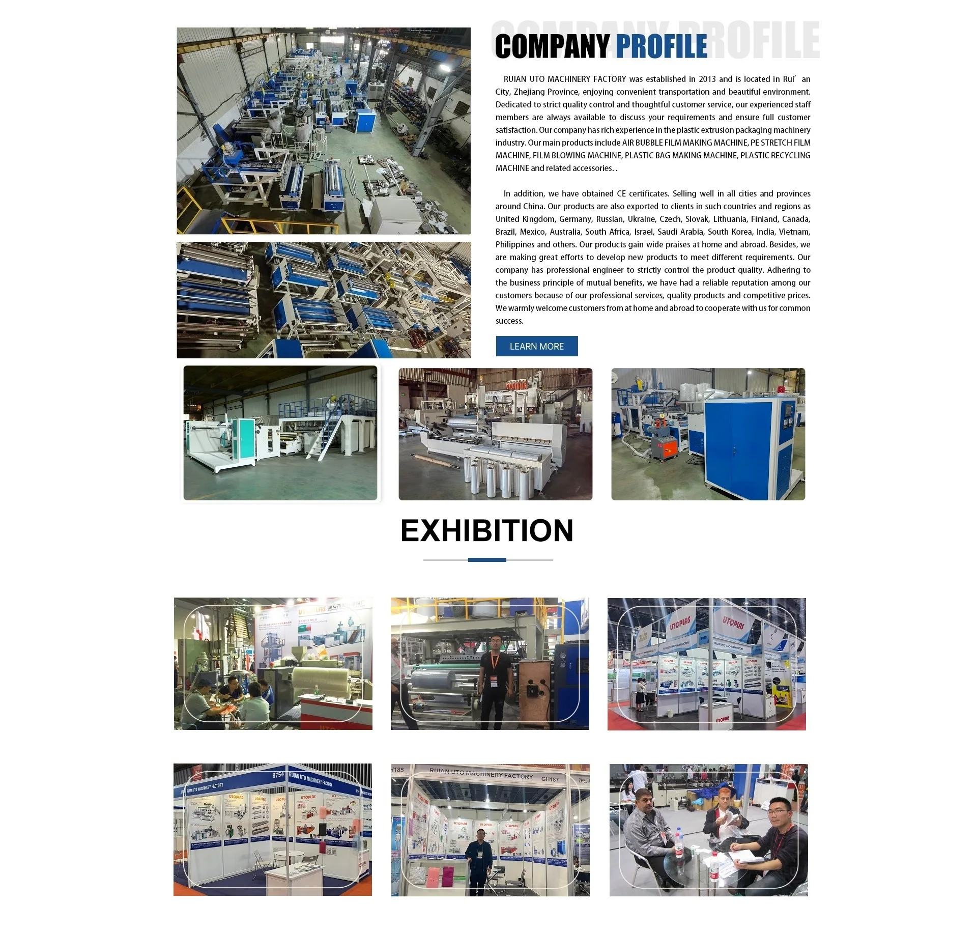 Principais produtos:Máquina de fazer filme de bolha de ar, máquina de filme elástico, máquina de sopro de filme, reciclador de aparamento de borda on-line, máquina de reciclagem de filme plástico